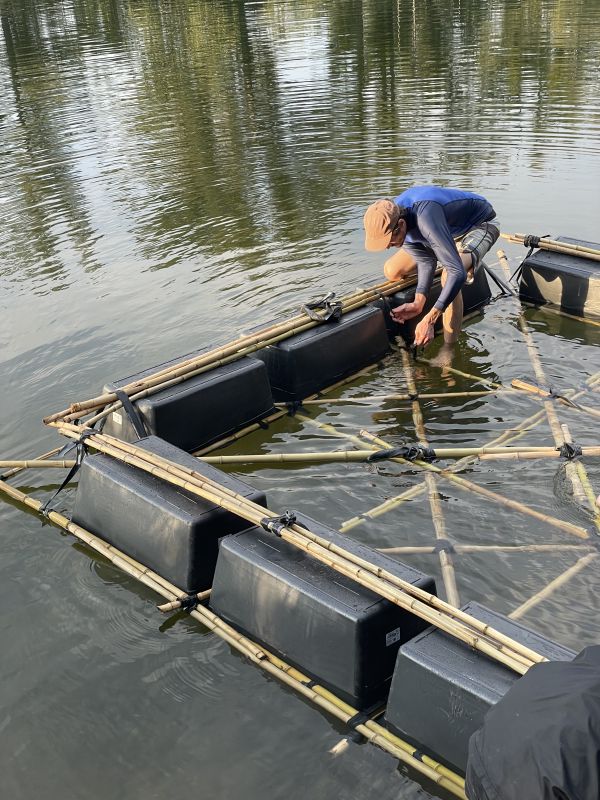 Cocreated raft with bamboo, buckets, and bicycle tubes.